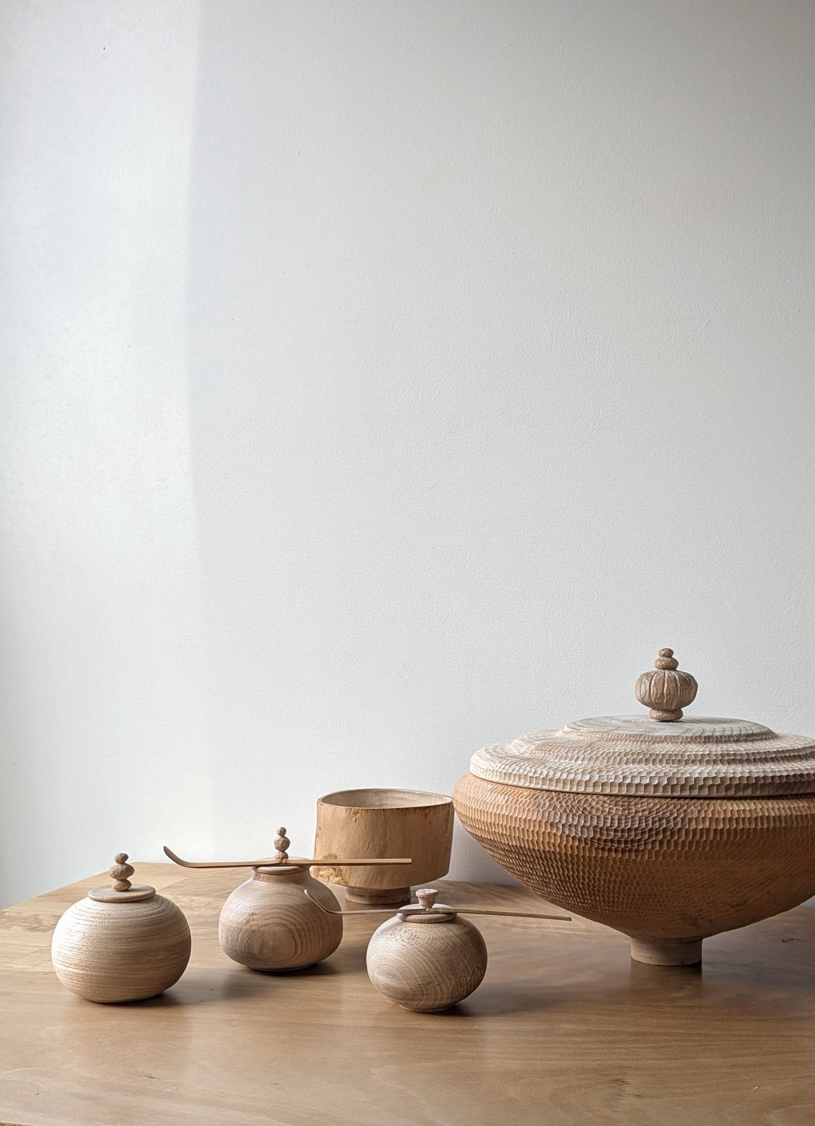 Devon based husband and wife team, Mark McGilvray and Kaori Takahashi share a collaborative practice that combines Japanese craftsmanship with Western woodworking techniques. Together they plane, chisel, turn, wax, and lacquer celebrating the natural beauty of the materials. Mark often shapes the forms and Kaori adds the detailed carving. Their carefully made pieces also incorporate the traditional Japanese method of urushi, a laquering technique that strengthens and protects wood.