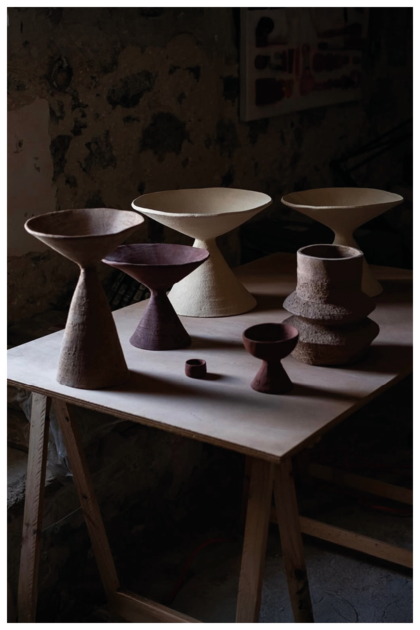 ‘My curious soul has led me to explore new forms, always using clays of various colors and textures to bring diversity to my collections. Inspired by Brutalist architecture and the Japanese technique Kurinuki, I continue to create pieces for my BRUTALIST collection. Creating pieces in a wide range of sizes, from small cups to large bowls and lamps. In my new collection, Imperfect Geometry, I play with (imperfect) straight lines, creating fruit bowls and vases. Each piece is unique and entirely handmade.’