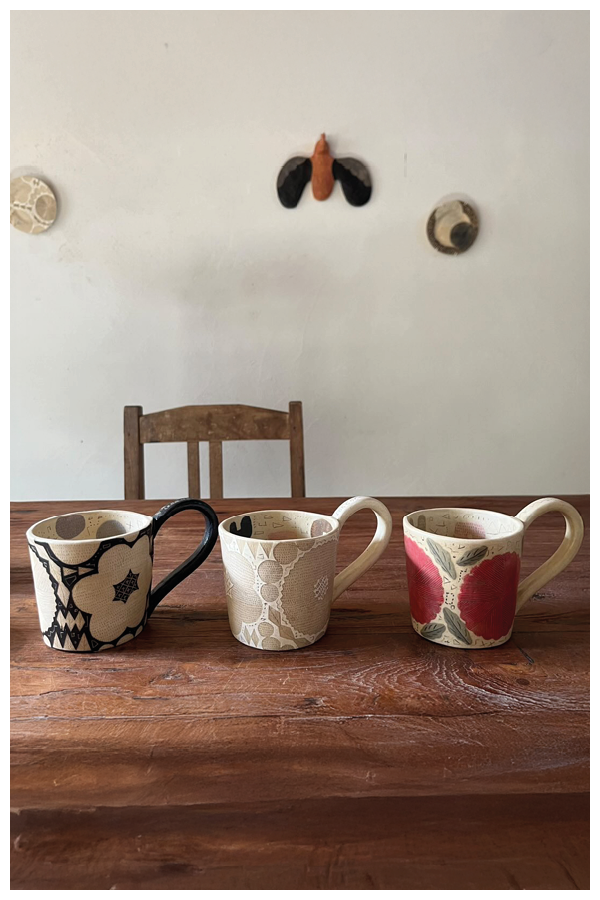 Kim Donaldson is a British ceramist based near the Georgian city of Bath. Her inspirations come from uncontrived compositions of everyday life. Arrangements of colours and textures that find themselves within a frame and catch her eye: fallen leaves by a rusted pipe, flowing patterns through streams of water, a bird sitting amongst sun dappled branches, and nature’s debris lying by everyday, unobserved manmade objects. She translates these observations into spontaneous, uplifting, and gentle patterns that are painted, stencilled or scratched into her hand built ceramics.