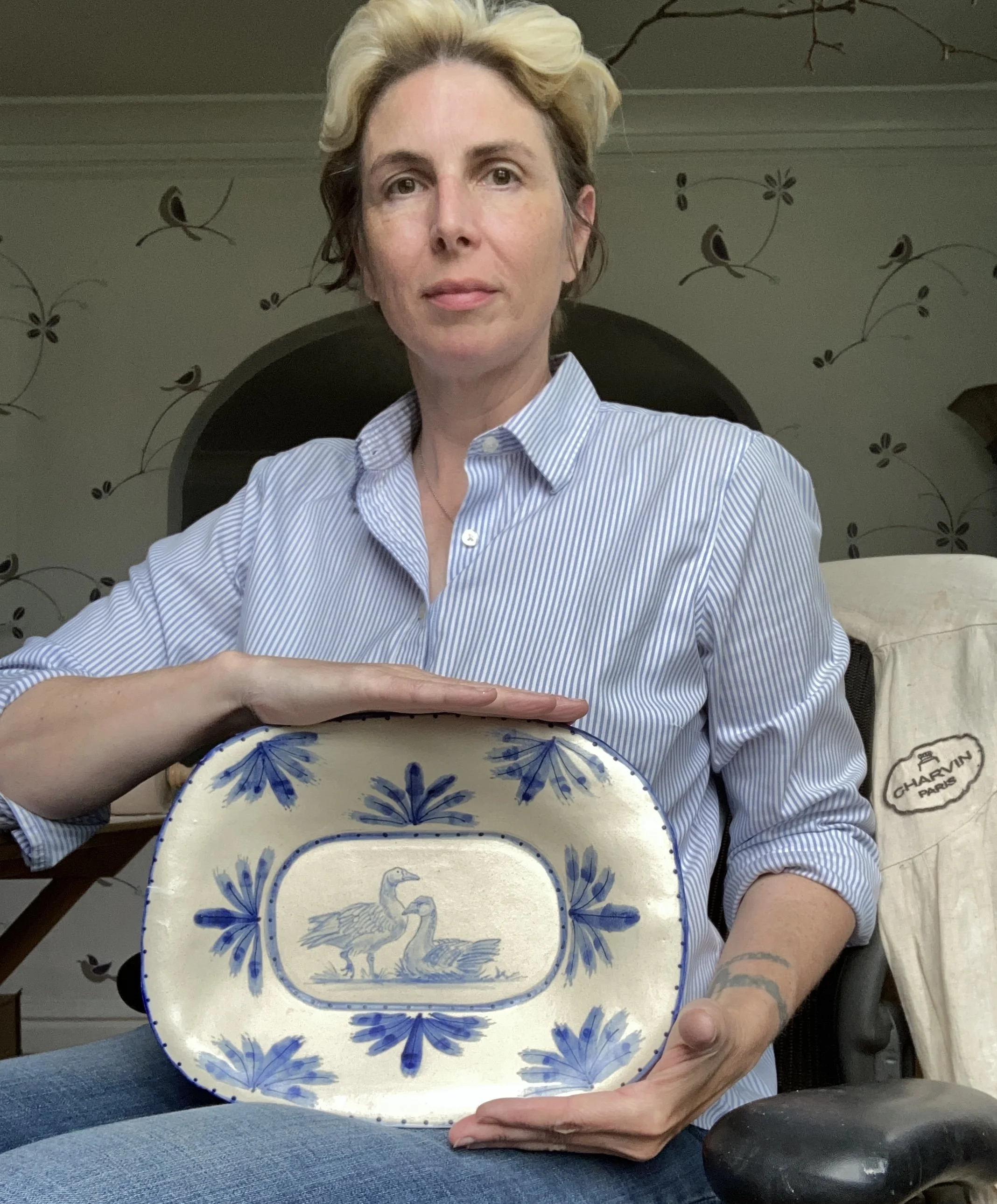 A full time artist, Maggie works in many mediums, painting, sculpture, she is a self taught ceramicist. First inspired by the tremendous decorative appeal of Delftware and Chinese blue and white, Maggie has developed the “Country Gentleman Collection“. These stoneware creations embrace the perfectly imperfect aesthetic of her hand built platters and vessels and are lavishly hand painted in scenes of the countryside and familiar animals in classic blue glaze.