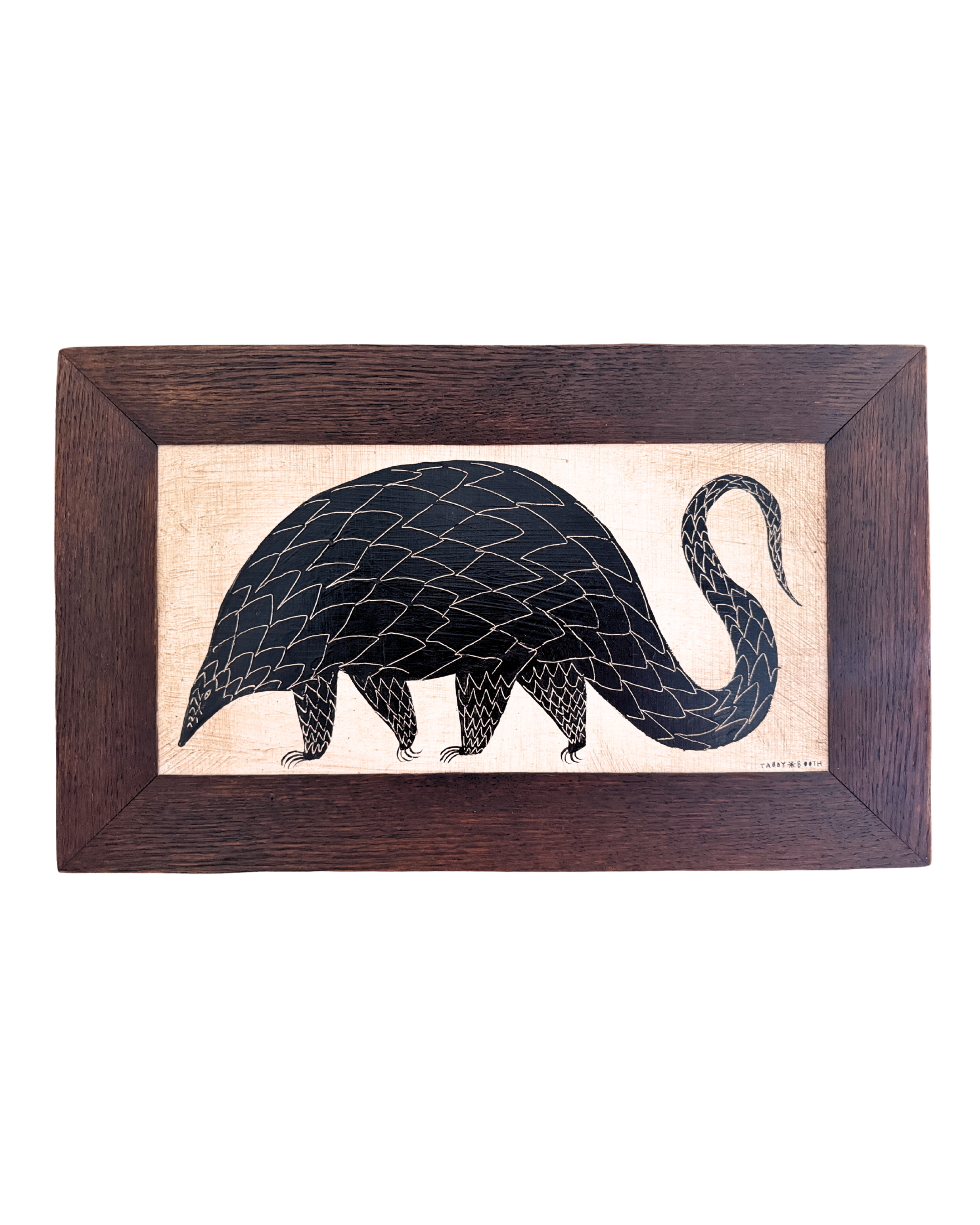 “The best things in life are about contrast, and for me, nothing looks more striking on a wall than that rich, bold silhouette. I love the juxtaposition of what appears to be an ancient relic, combined with a naive and whimsical element. Paint and wax is laid primitively onto bare wood in layers; I work quickly and without thinking. A character starts to show itself, the silhouette folding to fill the negative space. Sharp tools scratch rawly into the paint, revealing texture like scrimshaw.”